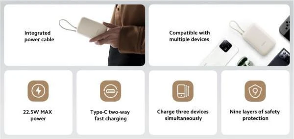 Бренд: Xiaomi; Заряжаемые устройства: смартфоны, планшеты и другие; Подключение устройств: USB Type-A, USB Type-C; Общая мощность, Вт: 22.5; Количество выходов USB Type-A: 1; Количество выходов USB Type-C: 1; Выходные значение заряда порта USB Type-A: 5V-3A; 10V-2.25A; 12V-1.5A; Поддержка протоколов быстрой зарядки: Power Delivery 3.0; Встроенный кабель (выход): USB Type-C