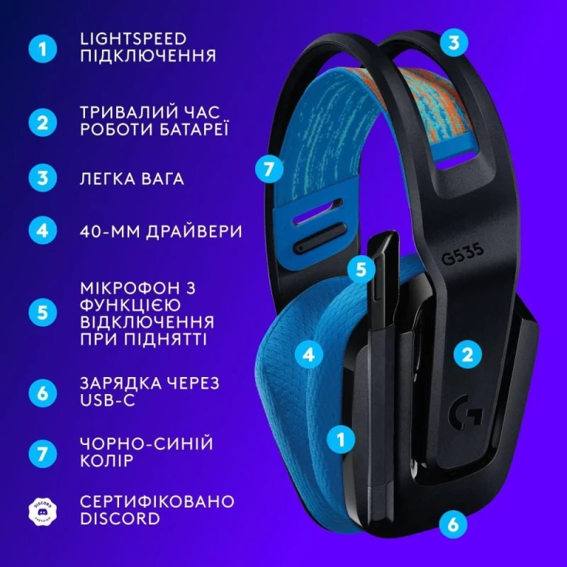 Бренд: Logitech; Линейка: G535; Способ подключения: беспроводной; Тип беспроводного подключения: Радиоканал; Тип конструкции: Полноразмерные; Тип акустического оформления: Закрытые; Тип крепления: Оголовье; Материалы (оголовья/чаш/амбушюр): Пластик+Кожзам/Пластик/Кожзам; Вес, г: 236; Цвет: Черный
