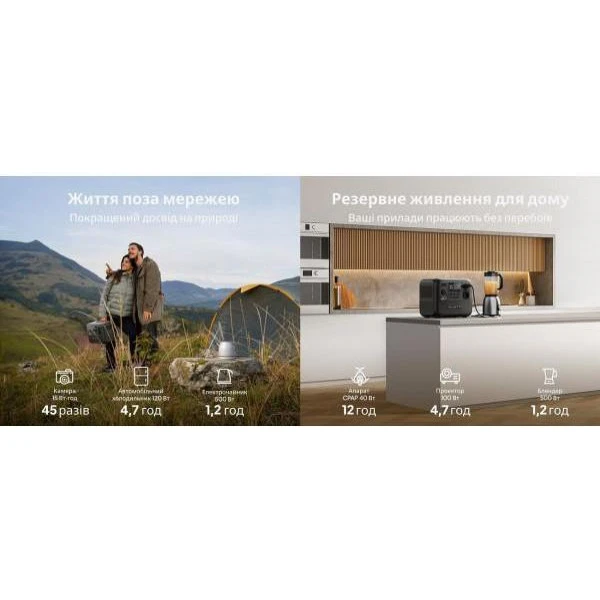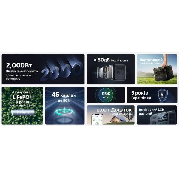 Бренд: BLUETTI; Розетка AC 230В: 2; USB Type-C: 2; USB Type-A: 2; Автомобильная розетка (прикуриватель): 1; Номинальная мощность, Вт: 1000; Пиковая мощность, Вт: 2000; Мощность USB Type-C, Вт: 100; Мощность USB Type-A, Вт: 12; Мощность автомобильной розетки (прикуривателя), Вт: 120
