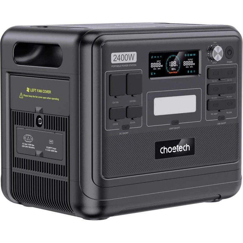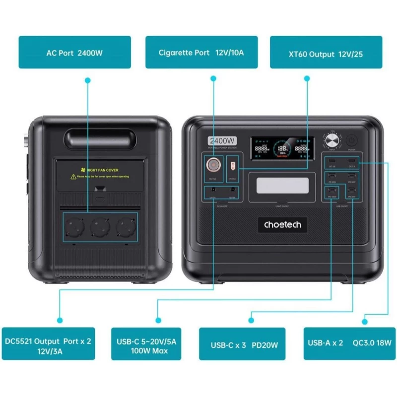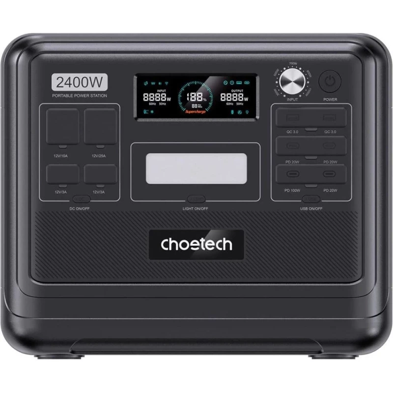Бренд: Choetech; Розетка AC 230В: 3; USB Type-C: 4; USB Type-A: 2; DC: 2; Автомобильная розетка (прикуриватель): 1; Anderson port: есть; Номинальная мощность, Вт: 2400; Пиковая мощность, Вт: 4800; Мощность USB Type-C, Вт: 100; 20; 20; 20