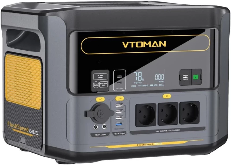 Бренд: Vtoman; Розетка AC 230В: 3; USB Type-C: 2; USB Type-A: 4; DC: 2; Автомобильная розетка (прикуриватель): 1; Номинальная мощность, Вт: 1500; Пиковая мощность, Вт: 3000; Мощность USB Type-C, Вт: 100; Мощность USB Type-A, Вт: 18; 12