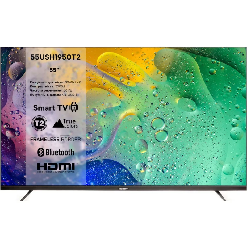 LED-телевизор / Диагональ 55" / Экран не изогнут / Разрешение экрана: 3840x2160, UltraHD 4K / Smart TV: есть / Поддержка 3D: нет / Частота обновления: 60 Гц / Количество USB портов: 2 / Поддержка настенного крепления VESA, мм: 200x200 / Т2-тюнер: есть / Габариты без подставки, мм: 1228x714x67 / Габариты с подставкой, мм: 1228x766x255 / Вес: 11,4 кг / Цвет рамки: черный